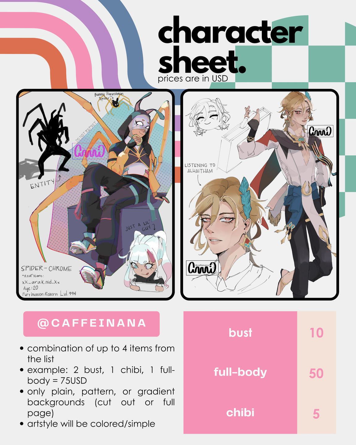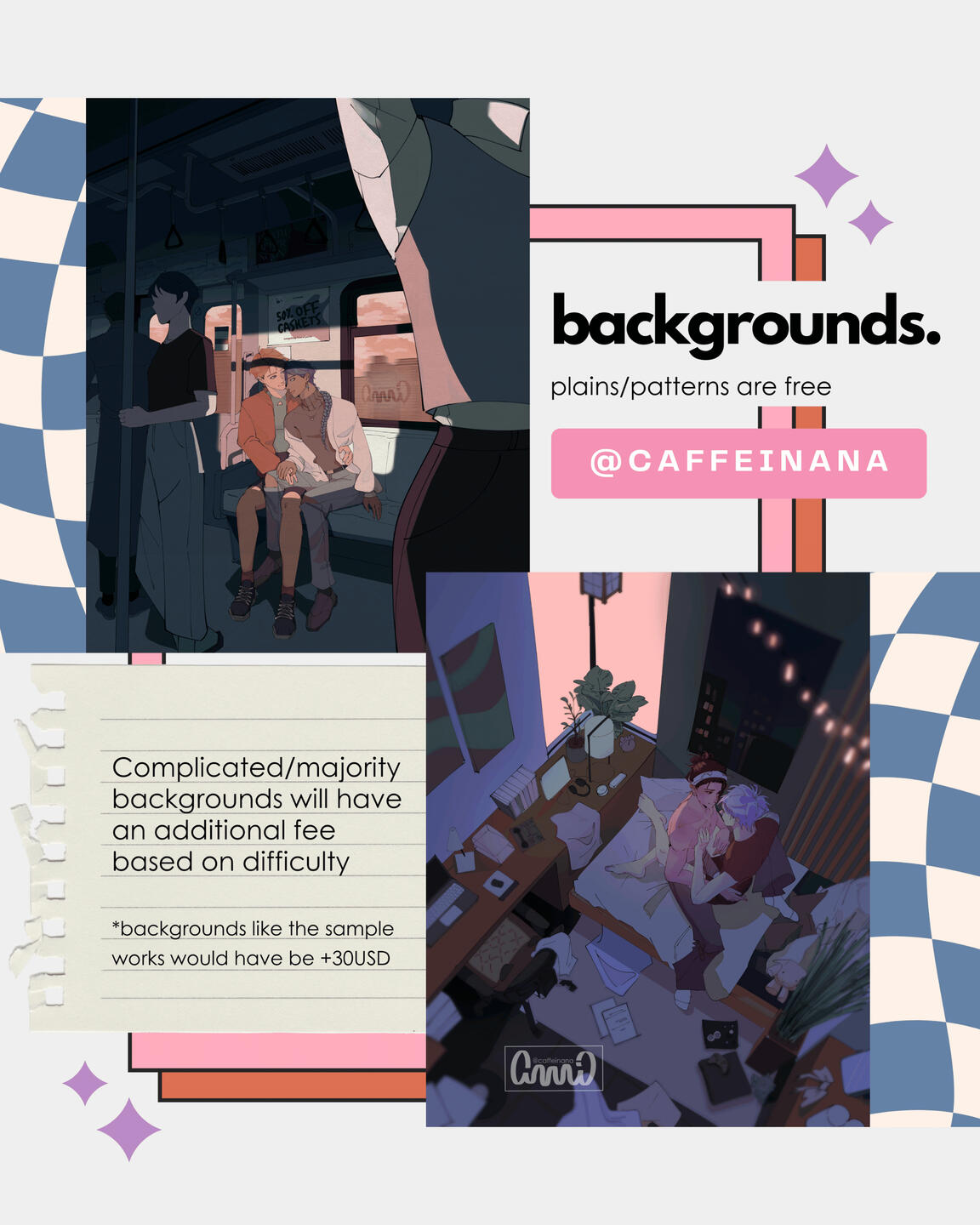 - plain or pattern backgrounds are free, intricate backgrounds will be negotiated separately.